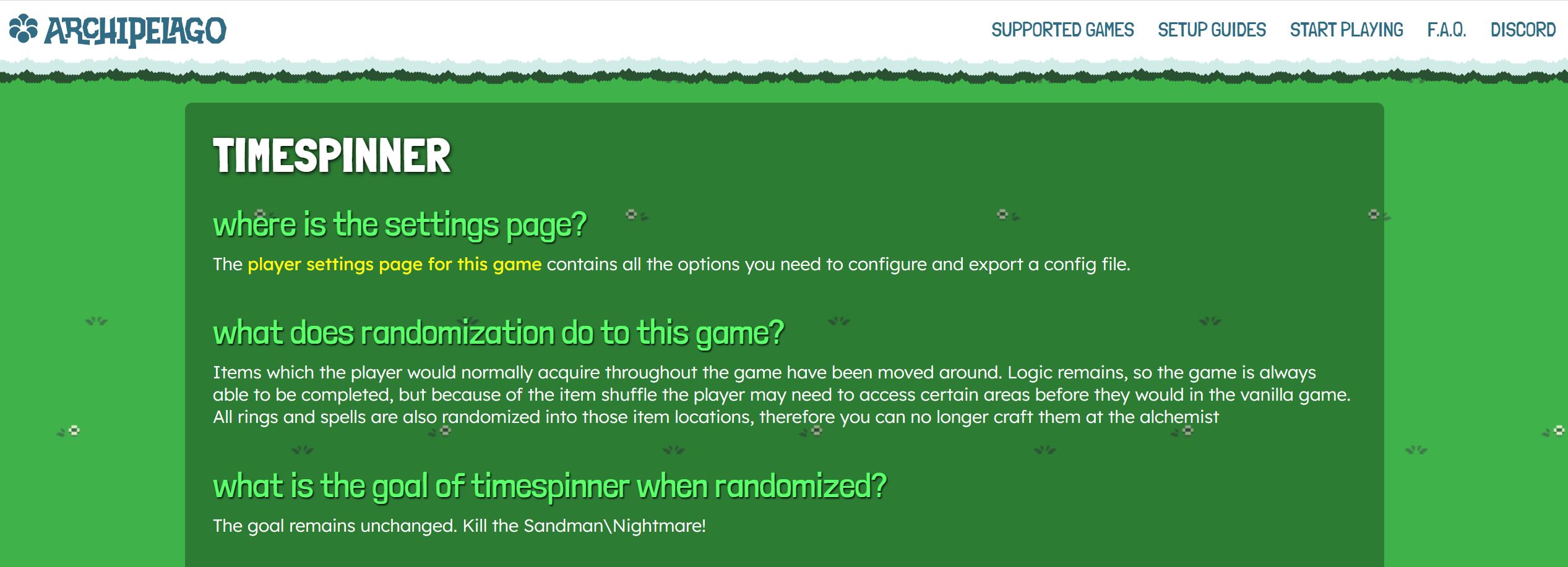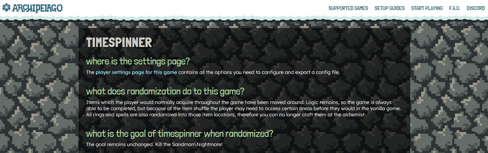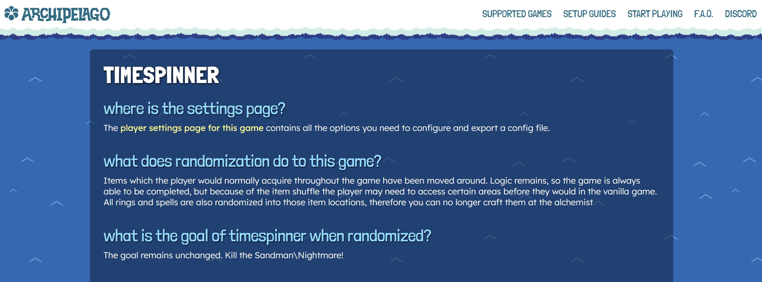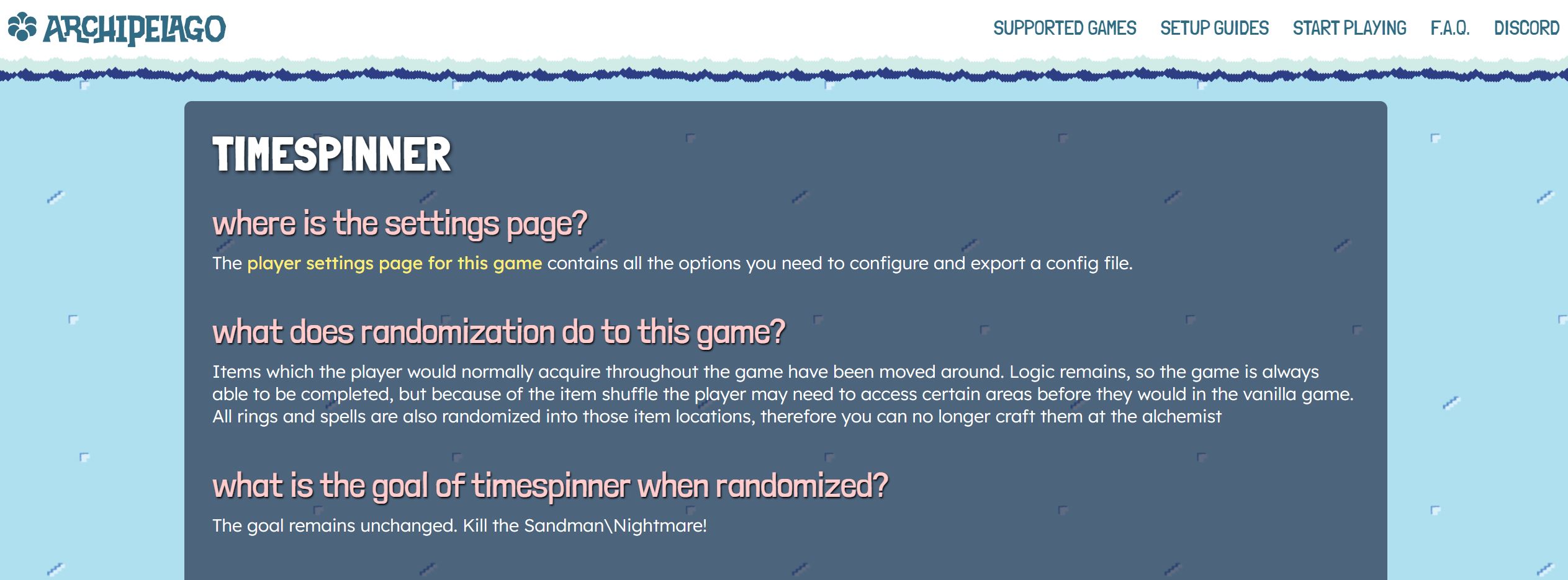 The game info page is for a short breakdown of what your game is and how it works in Archipelago. Any additional