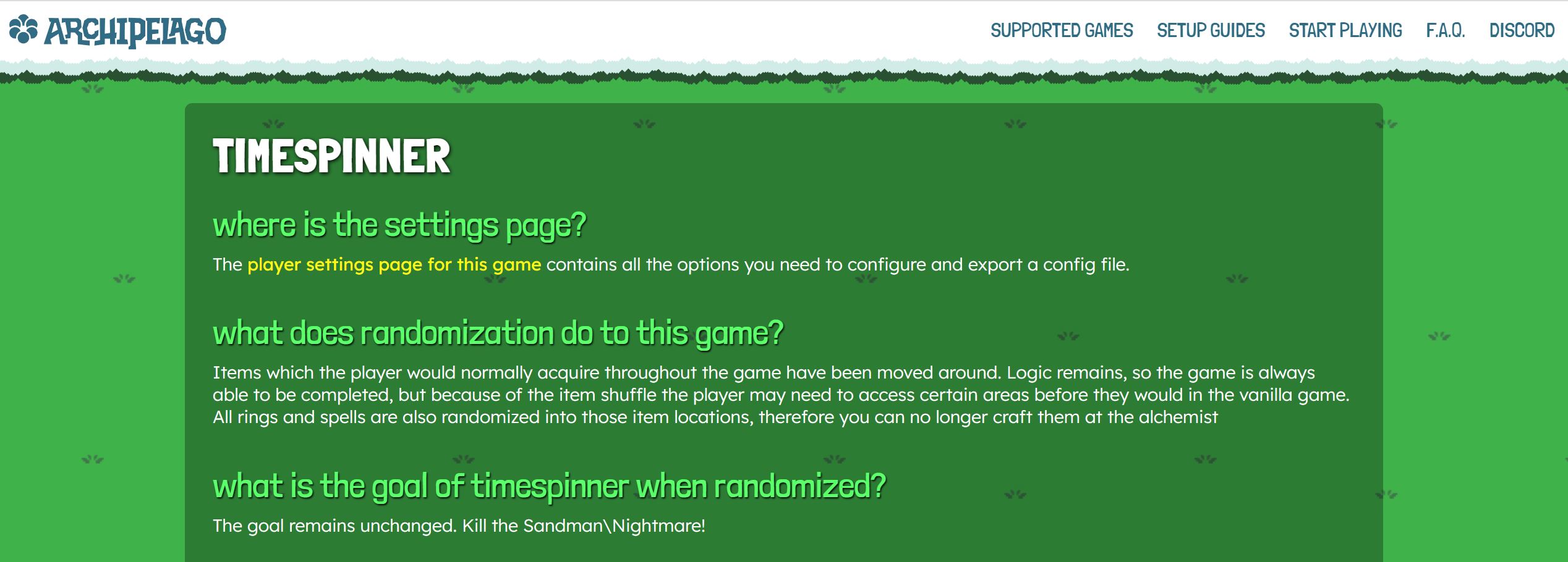 The game info page is for a short breakdown of what your game is and how it works in Archipelago. Any additional